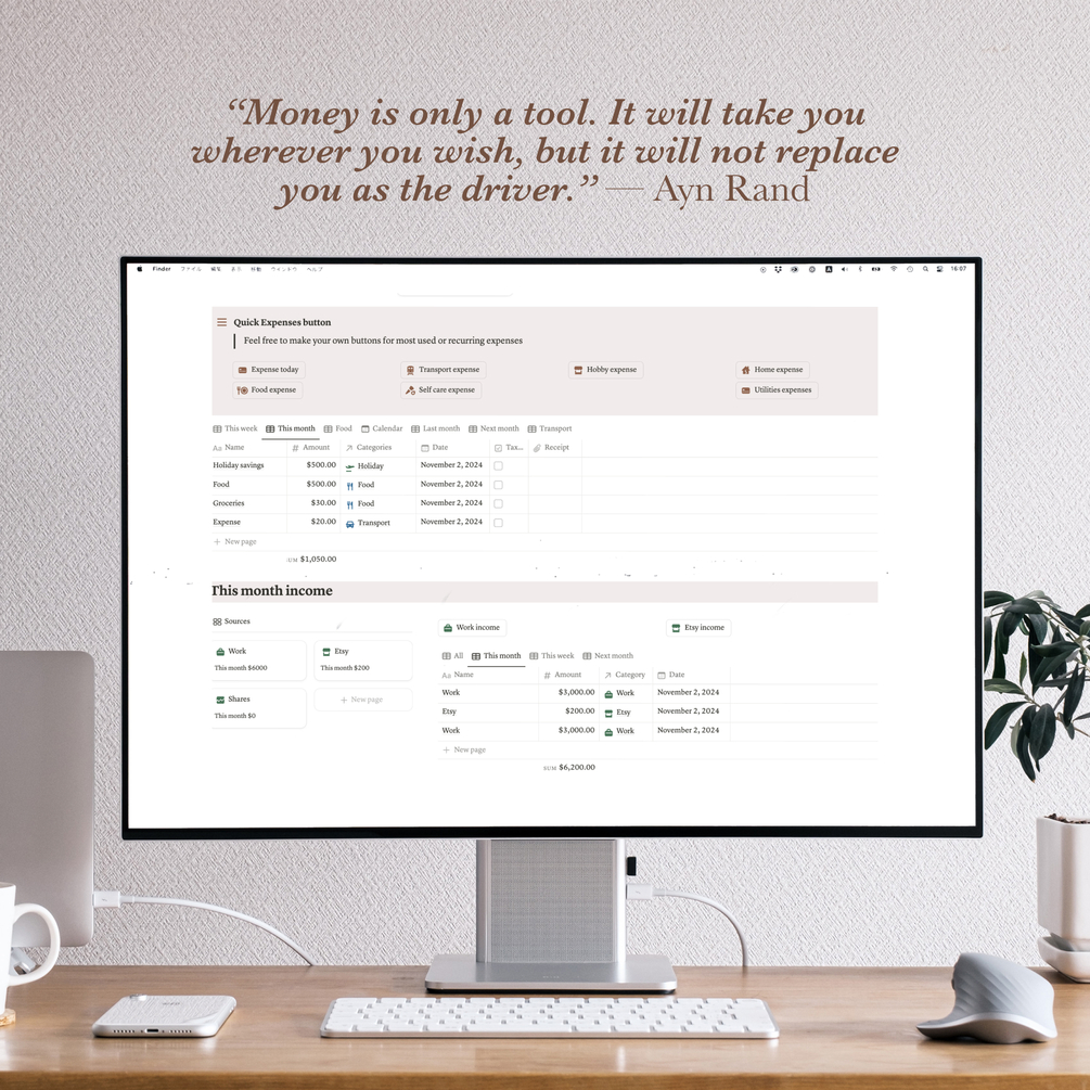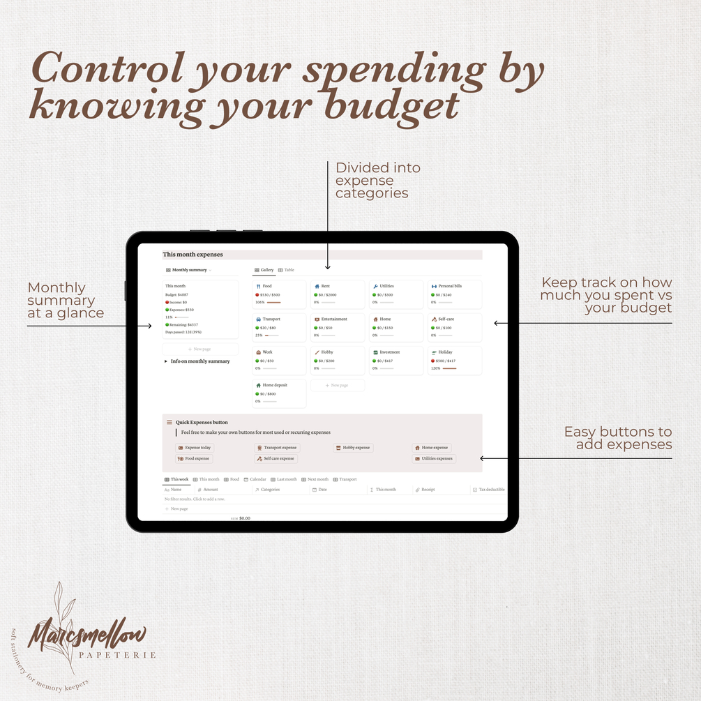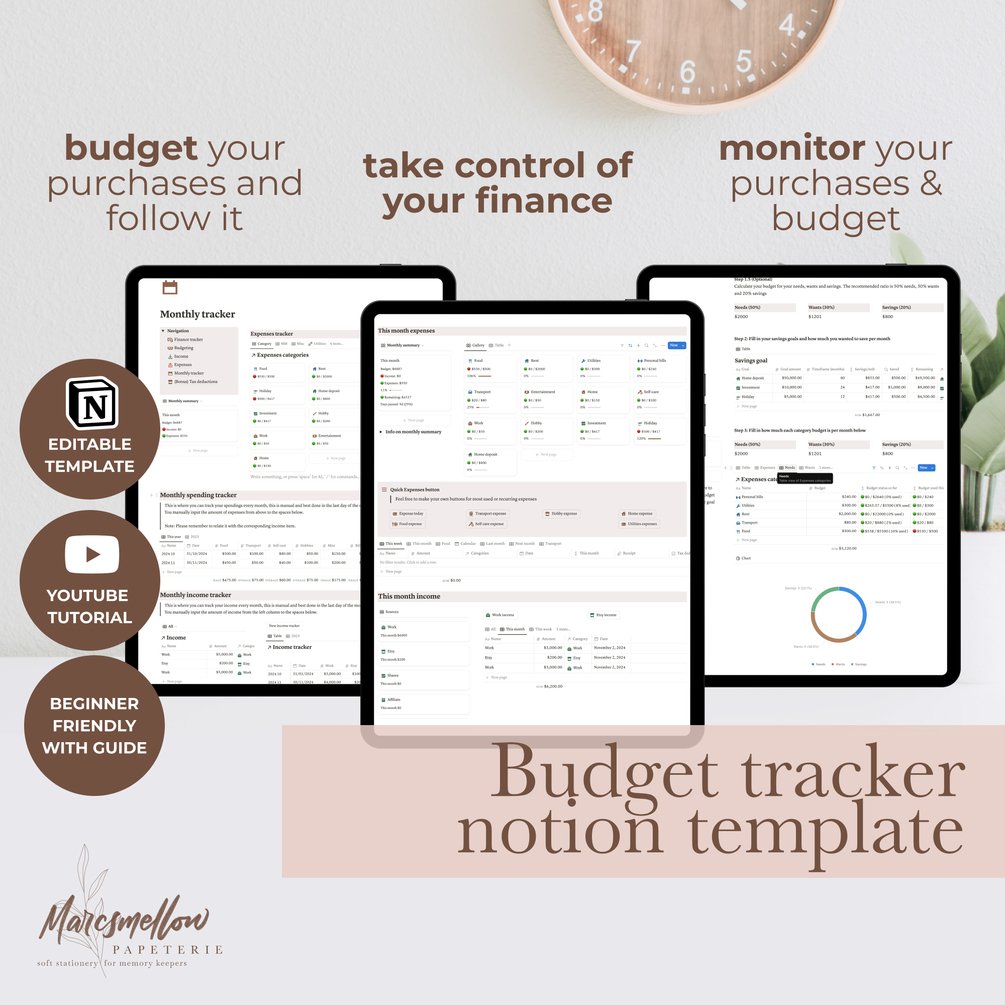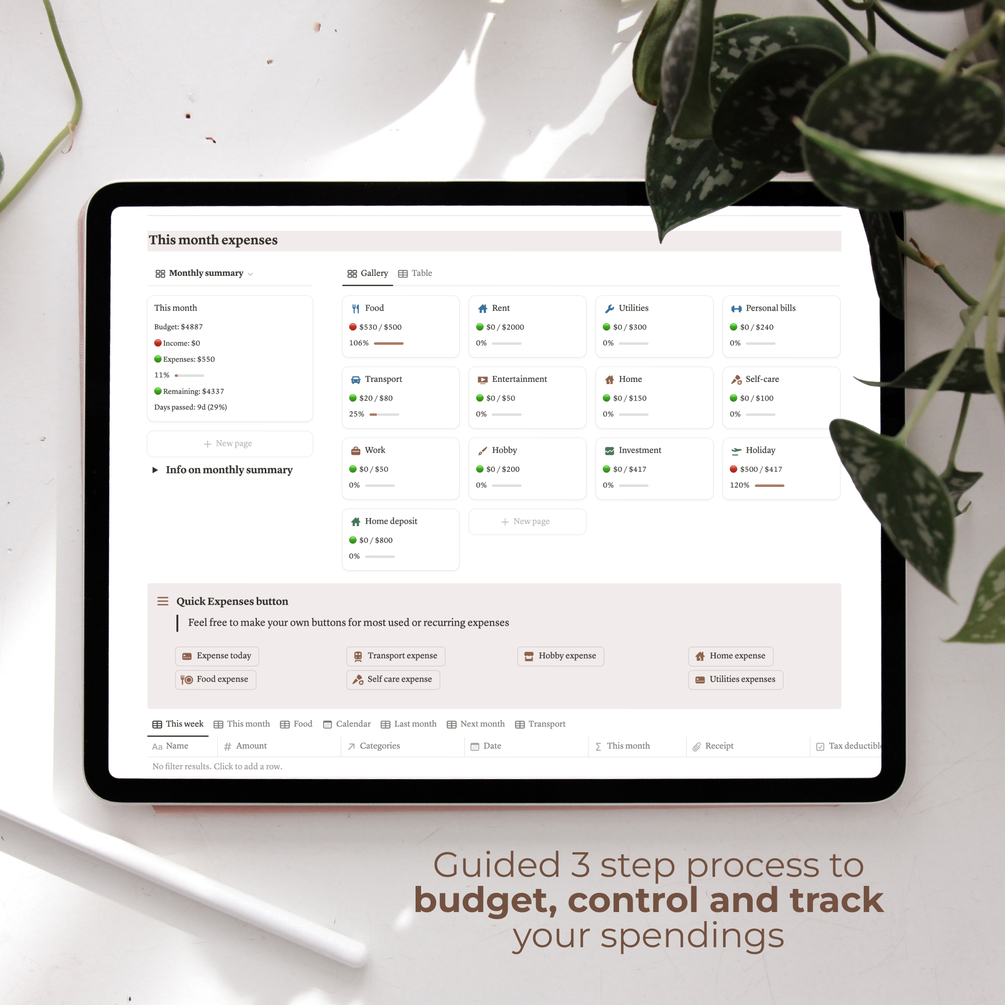 Notion budget tracker template; budget, monitor and track your expenses, income and saving goals