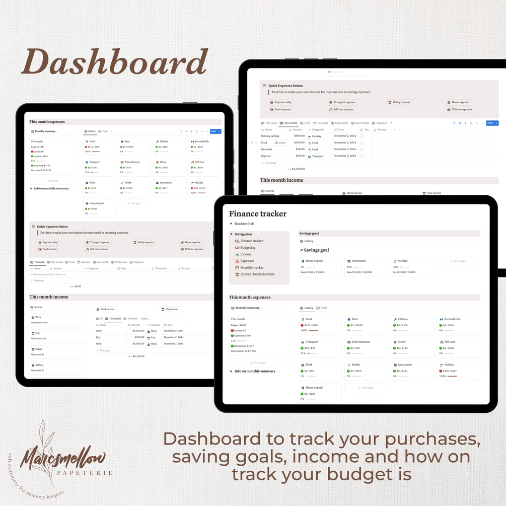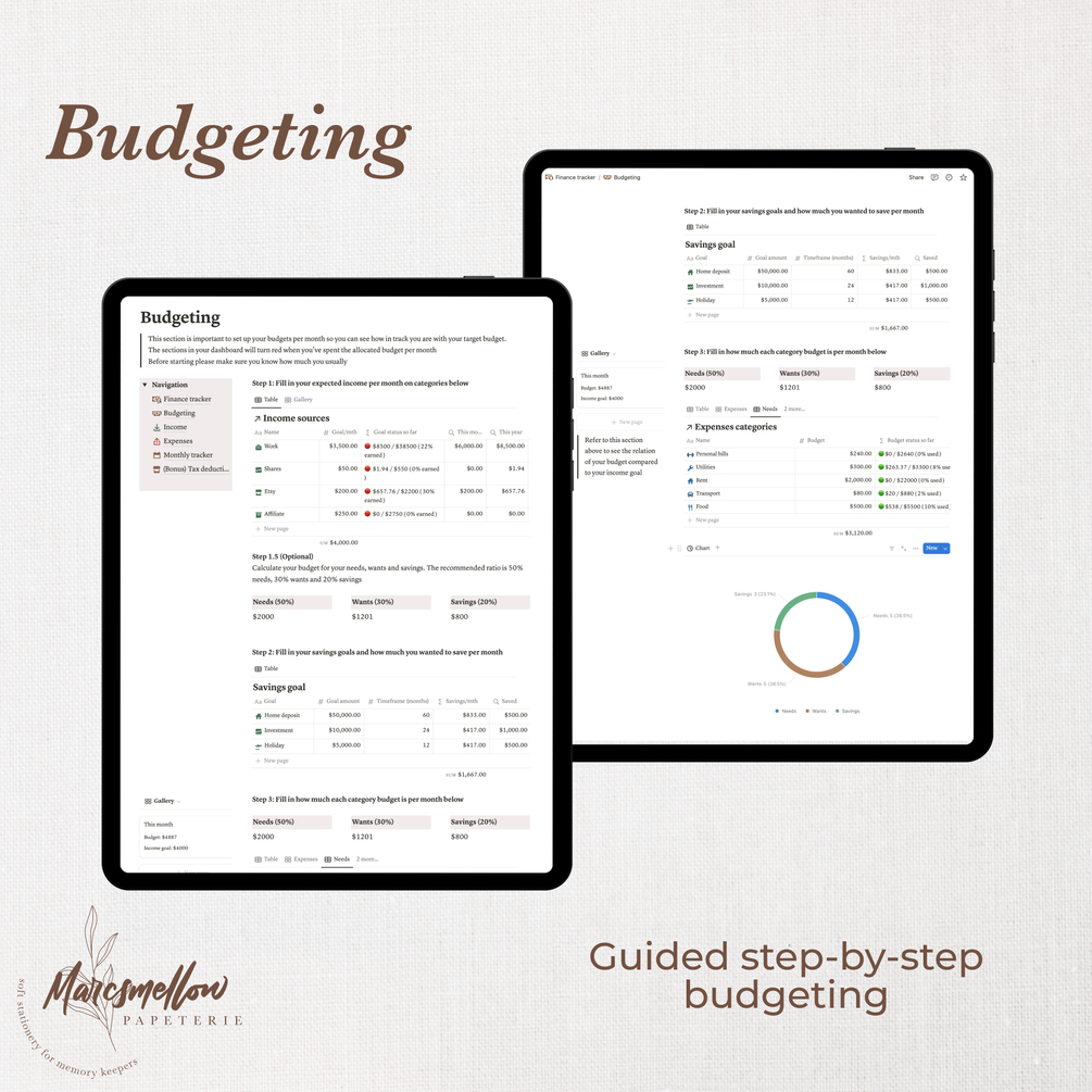 Notion template designed to help guide you through setting up savings goals, budgeting and figuring out your ideal numbers per month, then keeping you accountable and easily able to monitor your progress during the month.