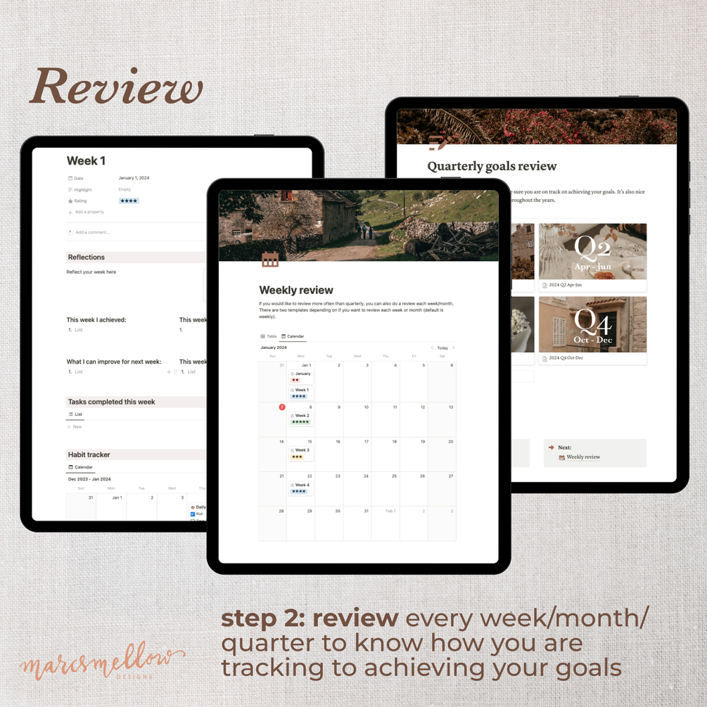 This template is designed to help guide you through reflecting your previous year, to creating your vision board and reviewing your life. It also takes you through setting your long term, yearly and quarterly goals, and eventually to habit tracker and quarterly/weekly/monthly reviews.