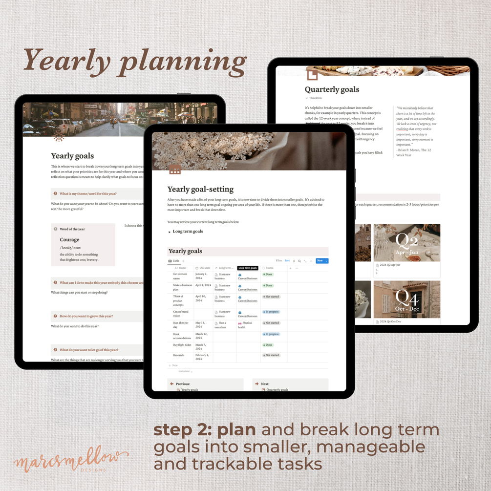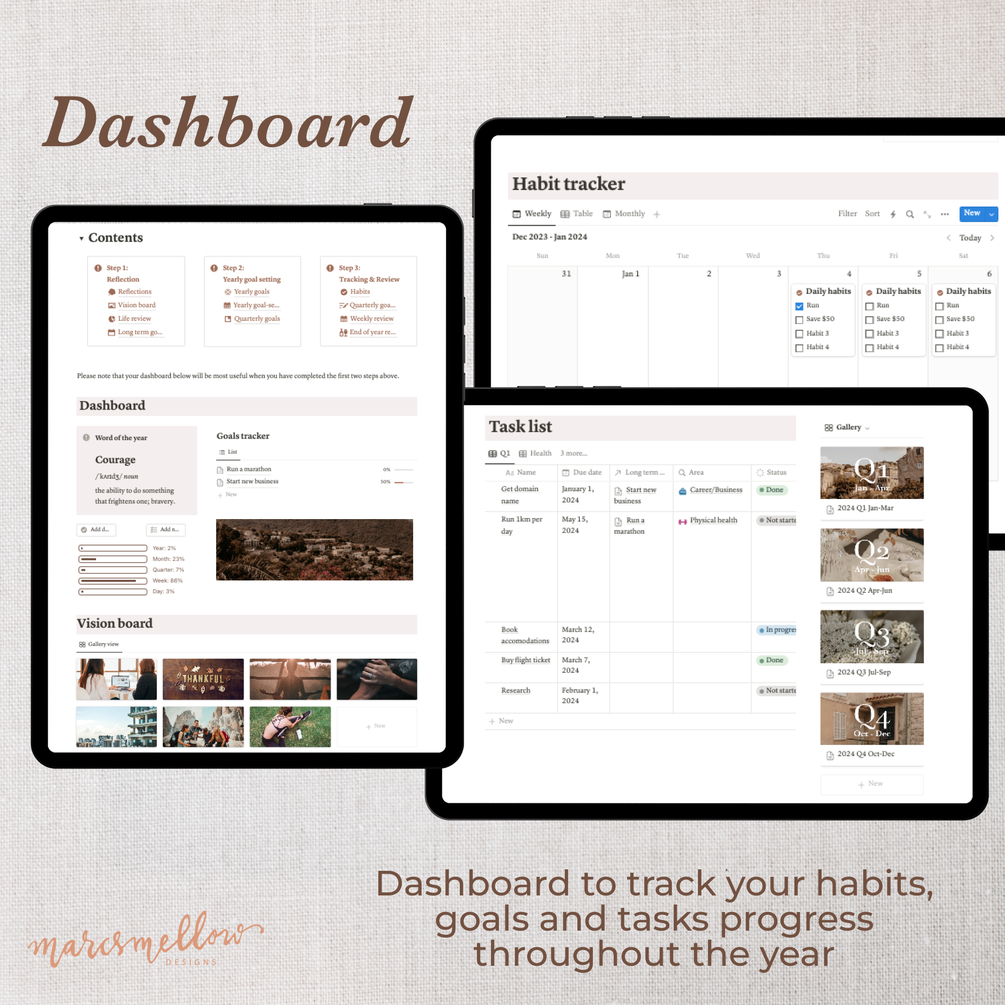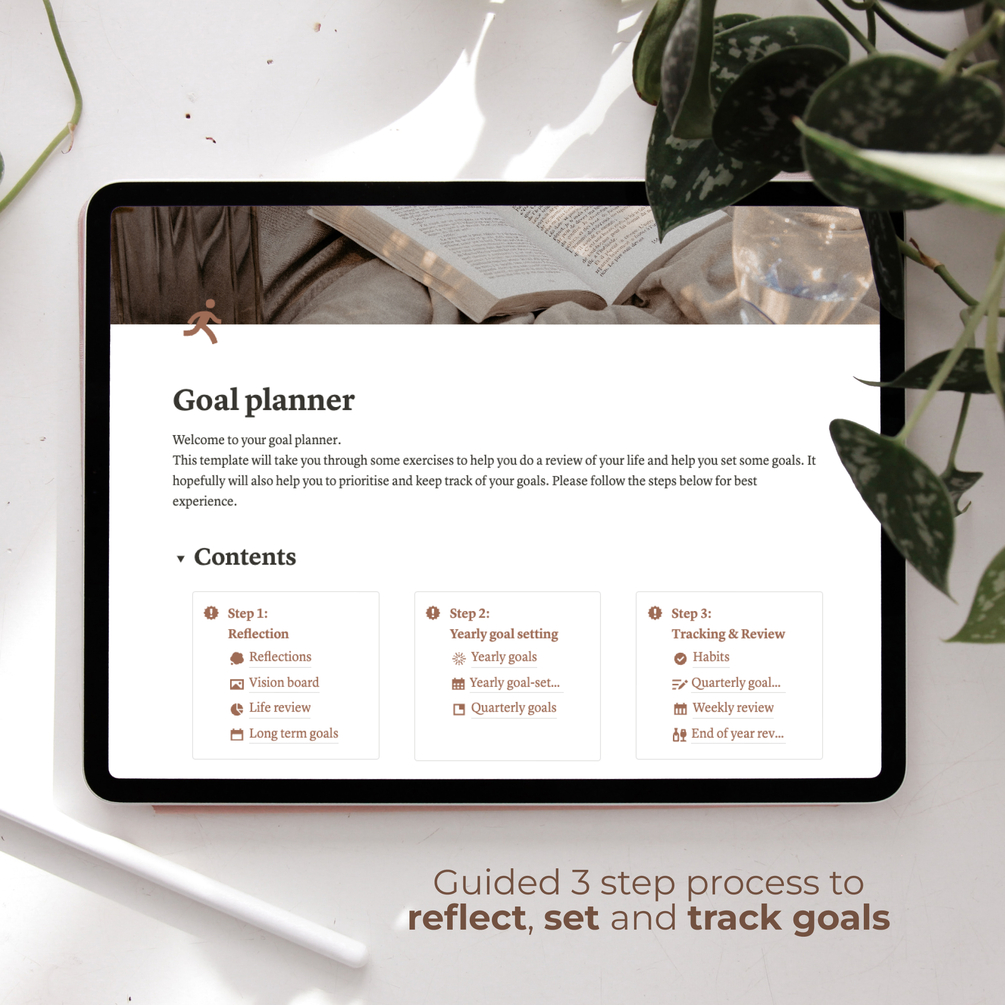 This template is designed to help guide you through reflecting your previous year, to creating your vision board and reviewing your life. It also takes you through setting your long term, yearly and quarterly goals, and eventually to habit tracker and quarterly/weekly/monthly reviews.
