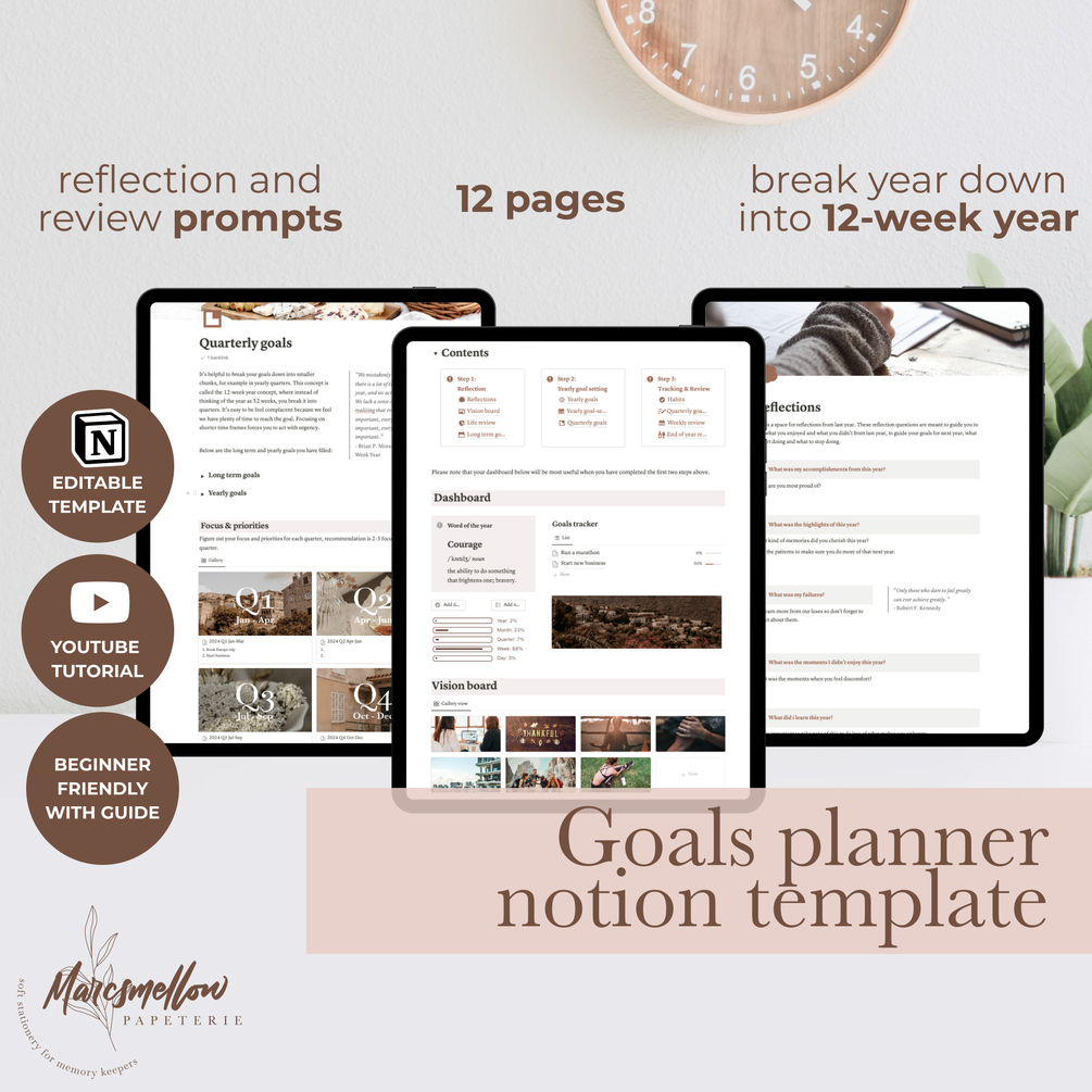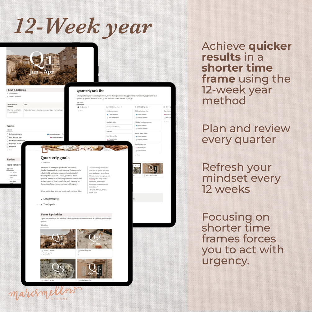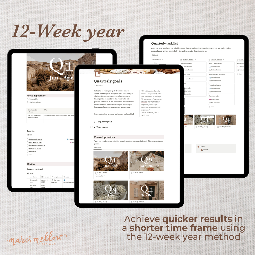 12-week year Goals planner notion template with cottagecore aesthetic