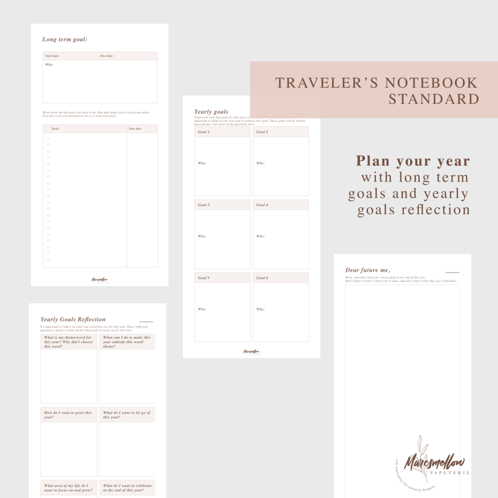 Tracking/review: This is where you will track all your goals. There is a habit tracker if your goal needs a habit change/upkeep, and we also have some quarterly reviews to keep us accountable, and then a nice end of year review to tie everything into a bow.