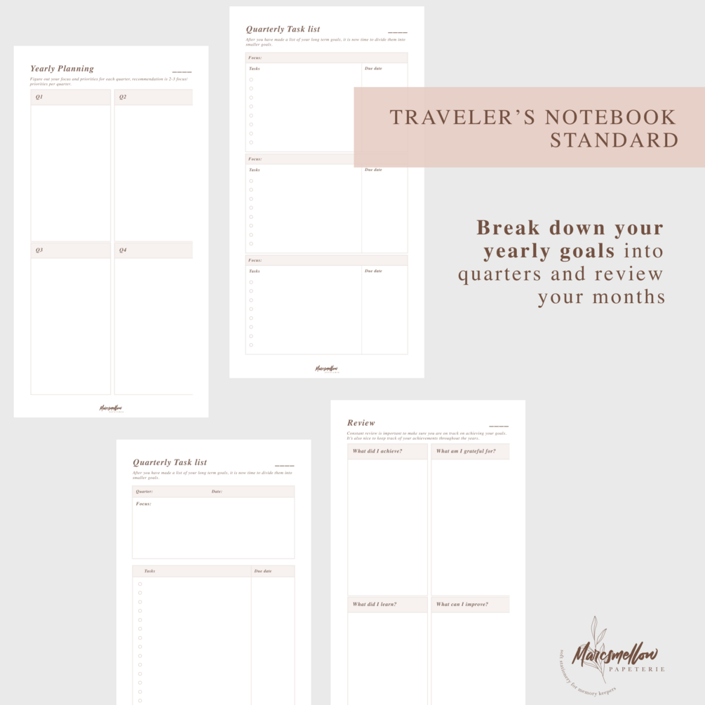 Tracking/review: This is where you will track all your goals. There is a habit tracker if your goal needs a habit change/upkeep, and we also have some quarterly reviews to keep us accountable, and then a nice end of year review to tie everything into a bow.